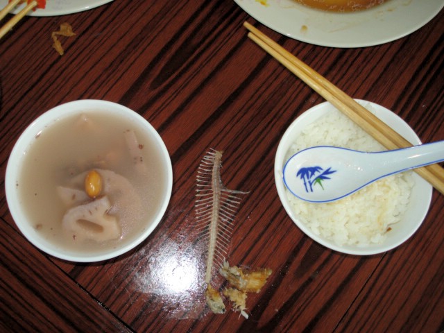 | I know it certainly doesn't look like anything special to you, but do you see that fish skeleton? It's lying there on the table in front of me. When Big Sister, our cook, who always sits to my right, noticed its 100% integrity, she brought it to everyone's attention and I was asked to lift it up and show it off. And I also learned how to say in Chinese: "I'm proud." You see, this is the first time I've actually managed to hold a battered, fried fish between two chopsticks and clean off the bones without breaking the skeleton. I need to share that I've been paranoid about fish bones ever since my maternal Grandmother used a spoon to free a smoked-fish bone from my throat. Grandma Charette, I think about you every time I eat fish that might have bones. |