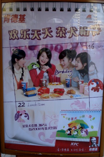 | On that same trip when Fish and I ate at a KFC, we walked past another KFC that was so full that about a dozen children and their parents were waiting outside for tables to become available. It was comical, and sad, to see a KFC employee leading the children in calesthenics while they waited to chow down on empty calories. Obesity among children is a new but rampant phenomenon. Young Chinese have access to sugary soft drinks, chips, and fast food and seem to enjoy them. I guess that is our culinary legacy to the world. |