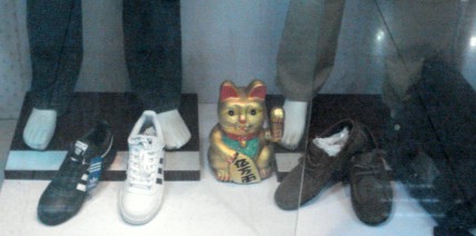 | These cats are everywhere, but, paradoxically, that's probably why I never would have noticed them if a friend hadn't given me one when he heard I was heading for China. I found out that the legend of the beckoning cat has its roots in Japan, where a cat is said to have lured benefactors to a Buddhist temple. The beckoning cat is a symbol of good fortune, and shopkeepers everywhere put up these statues to beckon potential customers to come in and do business. I saw them for the first time in New York City this past summer when I was studying Chinese. You might see them, too, if you look for them in the windows of oriental stores or restaurants in your hometown. |