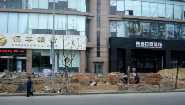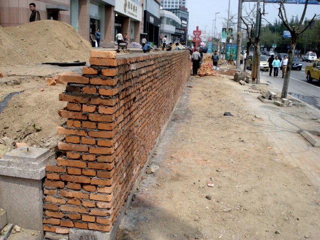| Here I see a couple of men working with pick and shovel in the ditch in the right foreground. And you can see the bricks and blocks from the original sidewalk and retaining wall stacked everywhere. | ||||||||||||||||