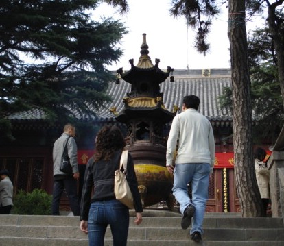 | At the top of these stairs is where I stood the remaining incense sticks in this large urn. Just a few more steps, then I knelt at the doorway, bowed three times, and entered the first prayer bulding. | ||||||||||||||||||