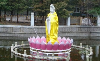 | On the way out, I stopped for a moment of silence by this large statue of my favorite Buddhist deity. She is Guan Yin, the Goddess of Mercy, devoted to saving humankind. Here she is depicted atop a lotus flower in a reflecting pond. | ||||||||||||||||||