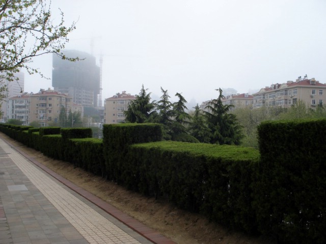 | I took this picture while going for a walk on the foggy afternoon of May 3rd. I didn't take it to point out what a sidewalk looks like, but we did just mention that subject in passing yesterday without giving you an example to look at, so here you are. Fish once told me that that small-tiled, light-colored section is to help visually-impaired folks find their way, and I don't think he was pulling my leg. But no, you see I took this picture because the hedge appealed to my anal, bushwhacking soul. Family and friends who know me best know I can be pretty obsessive about certain things, and trimming trees and bushes is definitely one of those things. |