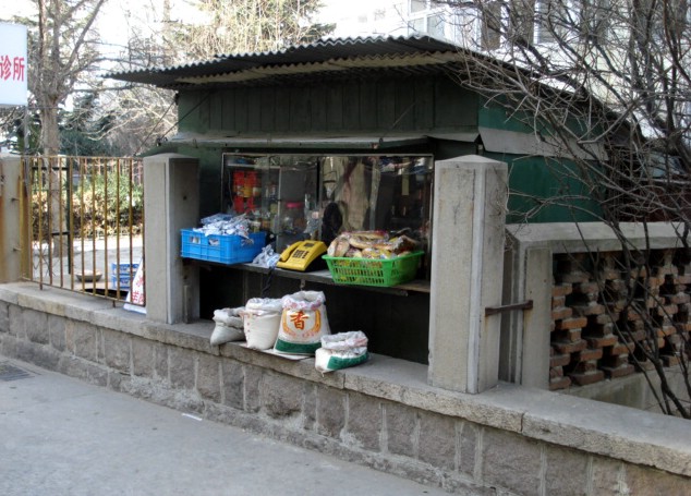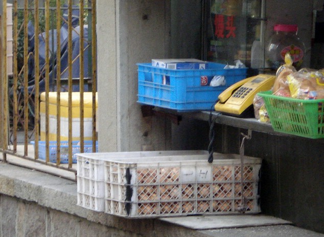 | This is a neighborhood stand that I pass whenever I take the alley short-cut between the bus stop and the Office. There were bags of bulk rice, beans, and seeds on the ledge the day I took this picture, but no eggs. |