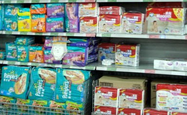 Procter & Gamble 'Pampers' and Kimberly-Clark 'Huggies' disposable diapers at Carrefour.
