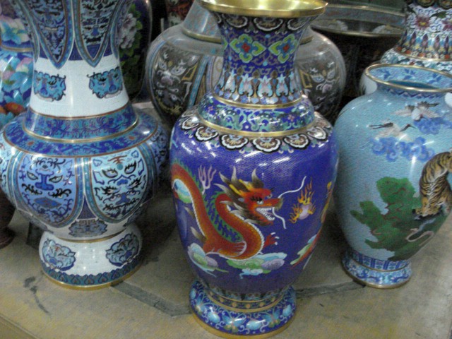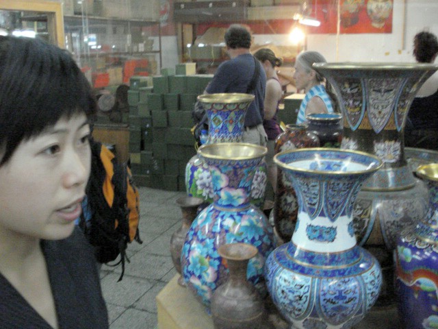 | As the saleslady is explaining, cloisonne is an art form that originated in Beijing around 1300 AD. | |||||||||||||||
