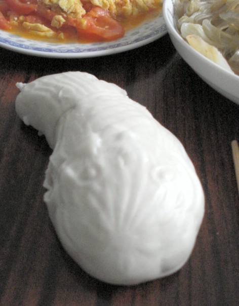 | I'm tired of "gross" food stories for a while, so I'm not going to talk about what we do with the various parts of a fish's head like the eyes, cheeks, and gills. I'll leave that for Jacob to find out for himself when he's here. Instead, here is a roll from lunch at work the other day that was made in a fish shape. It is unleavened, possibly boiled, and the best I can do to describe its taste and consistency is to tell you to think of a bagel. |