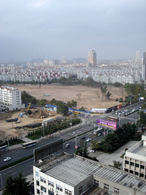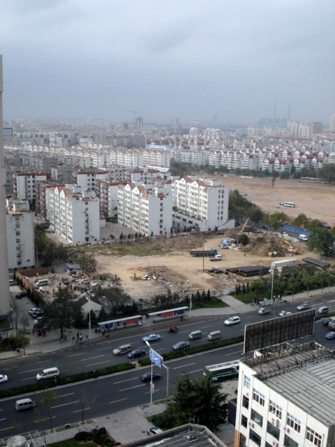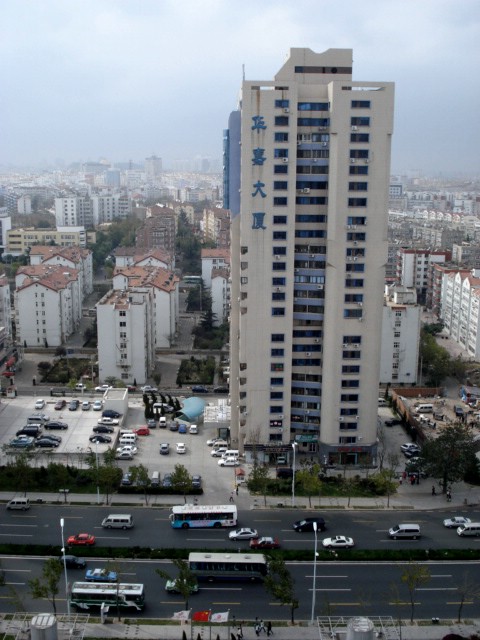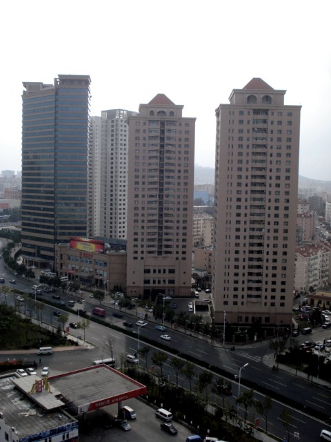 | Overlapping pictures looking right from my 18th floor window. Few bikes in sight. Lots of buses and cars. Container port in the distance. | |||||||||||||||
