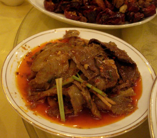 We've mentioned that pork is the favorite Chinese meat when we talked about eating pig intestines. Since then, I've had pig feet and pig snout. Just to let you know that we're not done, here's another pig body part that was served and enjoyed by all the other night at a Sichuan restaurant. (See the heavy-duty spices on the plate above the mystery meat? I tried one and it was HOT!) |
