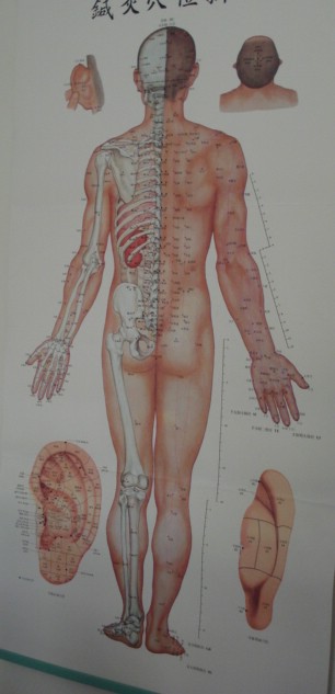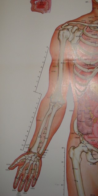 | Fish explained that the doctor was stimulating the entire meridian leading to the shoulder. Stimulation of meridians, or energy paths, to bring balance and health is the underlying philosophy of accupuncture. It is a very detailed practice, as these charts indicate. | ||||||||||||||||