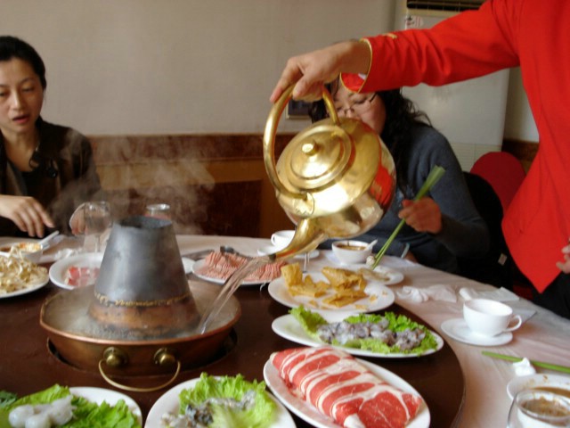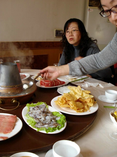 | A supplemental shot of boiling water, although the coals seemed to keep things cooking. I see beef, pork, lamb, oysters, squid, shrimp, abalone, garlic cloves, leeks, lettuce, and a type of chip. |