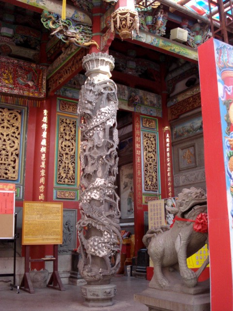 | This is the right side of the center entrance to her temple in Tainan. This center entrance is only used for processions on special occasions. We entered through one of the two side entrances flanking this entrance and then passed through the doorway you see open in the background. | ||||||||||||