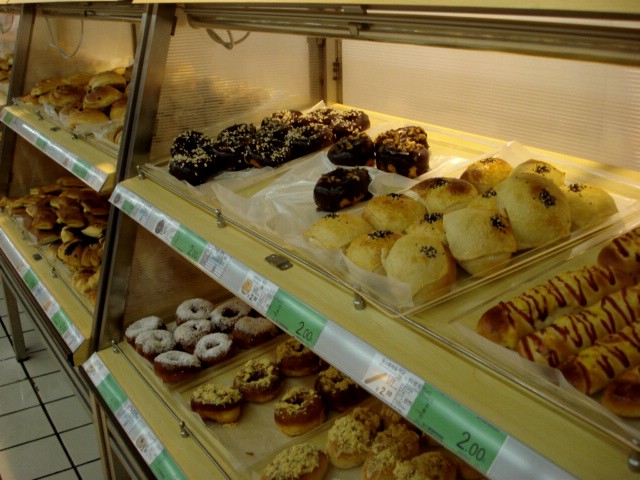 I get bread and bulk cookies here. They have all kinds of interesting bread. My favorite is three-grain peanut bread. It has a peanut butter filling so all you need is jelly. Among so many other choices, you can get long thin loaves of french bread or chunks of massive loaves of dark bread. As for these doughnuts, I haven't tried any yet. |