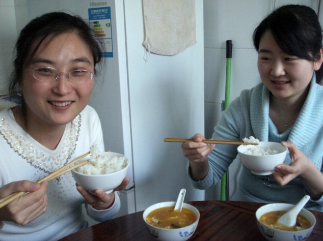 My co-workers Cherry and Gracie helped me at lunch yesterday when I explained the question about rice. The simple answer is that we eat sticky rice in China--it clumps up easily--as opposed to the rice we tend to eat in the States where each grain retains its individuality. Also please note how we pick up the rice bowl and hold it closer to our mouth. |
