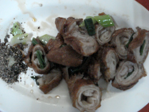 | Our contact wanted me to try this first before he told me what it was, but I already knew and enjoyed it anyway--especially since it was the crispy version. That's pepper for dipping over there on the left. | |||||||||||||||