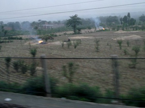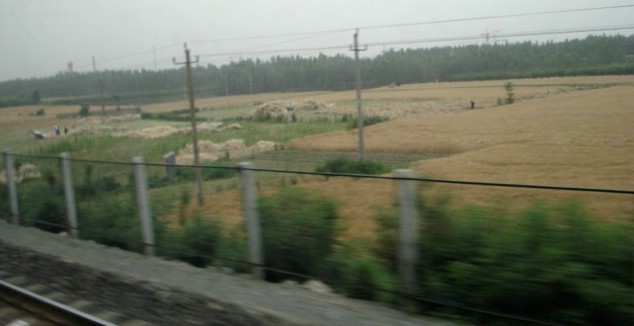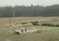 | See those little specks halfway up the left side of the above picture? The picture to the right was taken next. It's blurry because I've blown up the people. Trust me, they're threshing the grain by hand. |
