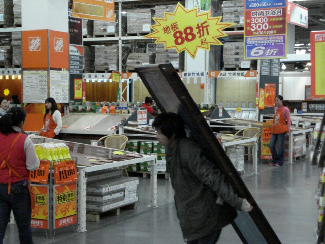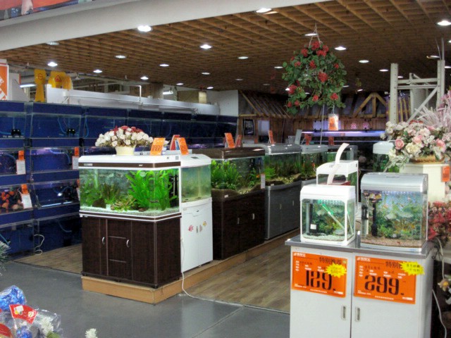 | The only surprise was the aquarium department shown in the bottom left picture. Other than that, you would feel right at home, with the exception that the place, like all retail outlets, was simply crawling with Customer Service folks. No paging system required to get assistance in China, that's for sure. And, being the good American impulse shopper that I am, I bought an 18-inch-tall fully-decorated artificial Christmas tree for the Office. |
