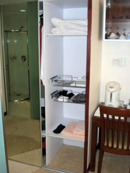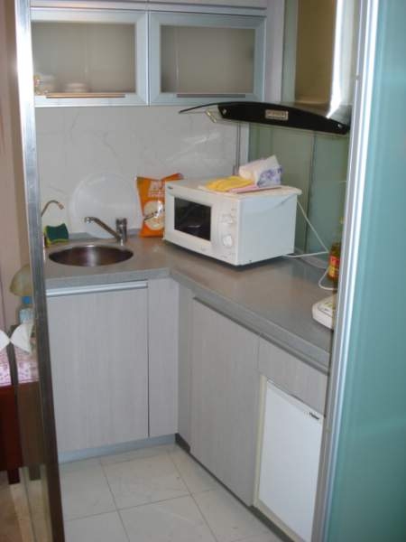 | I cook supper for myself every evening I spend at home. I'm fortunate that my wife and the Chinese English teachers who stayed at our home taught me how to use a wok, because that is my primary culinary tool. Of course, it's great to have a microwave for popcorn. And the small refrigerator you can see in the lower right corner of the picture is plenty adequate. The sink has two spigots--one for filtered, | ||||||||||||||||||||||||
