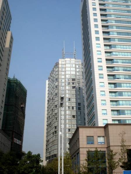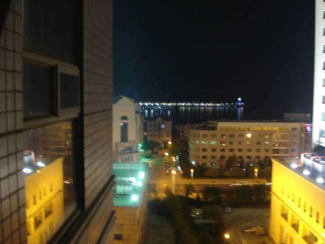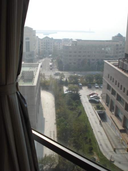 | That's my building in the center background. I can spot my apartment about a third of the way up on the corner, but I don't expect you to be able to. The building on the left is under construction, and I will have more on that later. I took this picture with my back to the bay. Below are two shots from my apartment toward the harbor and bay which is the venue for the 2008 Summer Olympics sailing events. |