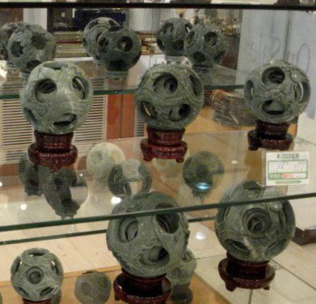 | These balls represent many generations of a happy family. Something like an onion in basic construction, except that each successive layer has been carved out in such a way that each is free-moving. Of course, each ball started as a solid ball of jade. | ||||||||