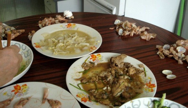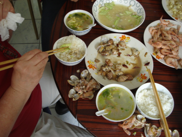 | Karen held her own with chopsticks. Her bowl of egg-drop soup is above her rice bowl. Mussels and shrimp in front. | |||||||||||||||