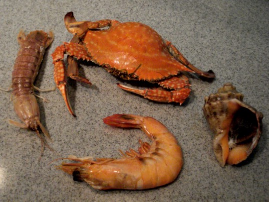 | I'm sure the crab and prawn look familiar. We use our teeth to crack the crab legs. That critter over there on the left reminds me of an itty bitty lobster and is tricky to clean without stabbing yourself on its prickly armor. I have sore fingertips today. | |||||||||||