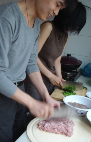 | Cleavers a flying. The most popular filling is pork, but, since pork aggravates Karen's gout, tonight we're having fish dumplings and lamb dumplings. Da Peng had killed and cleaned the fish just before we'd arrived, and here he's working on mincing the lamb. |