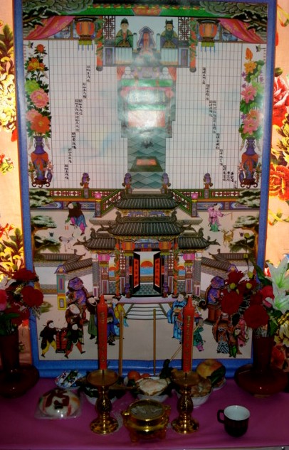| One of the few things that we correctly have learned about China is that they honor their ancestors. Here is the paternal family tree displayed prominently as a shrine. The deceased paternal grandmother is named at the bottom on the left and the deceased paternal grandfather is named at the bottom on the right. |