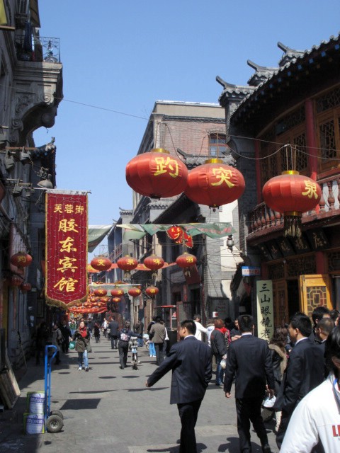 | Qingdao is in Shandong Province and has a population of 7 million. Jinan is the capital of Shandong Province and has a population of 5.5 million. Qingdao's growth has been relatively recent. Jinan, in contrast, is one of the birthplaces of Chinese civilization with cultural relics going back 7000 years. As you will recall, Fish and I took the high-speed train to Jinan not too long ago. It was by pure chance that we chose to walk down the street featured here, but it was a walk into the past. | ||||||||||||||||||