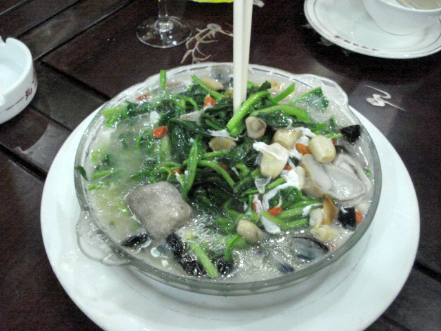 | We started by sharing a spinach dish with cut-up preserved duck eggs and whole garlic cloves. | ||||||||||||||||||