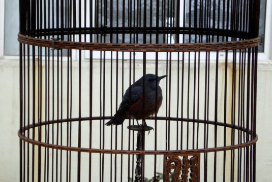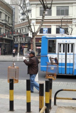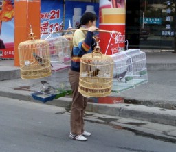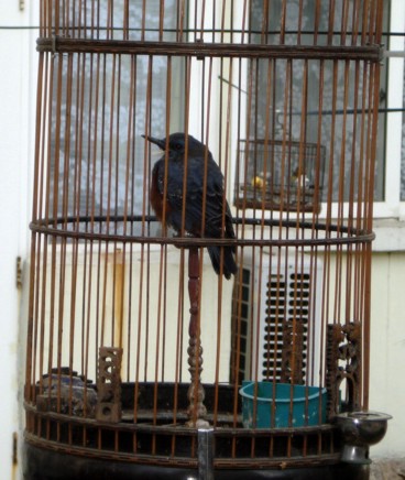 Pet birds is kind of an old-man thing around here. They take the birds along to the park where the old men sit and chat with friends while the birds sing. |