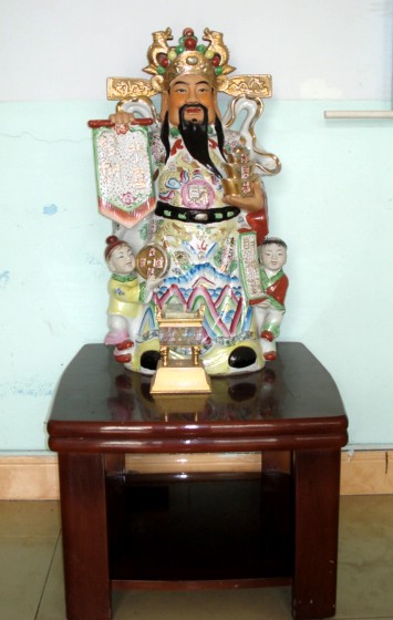 | If I'm not mistaken, this is a representation of Lu, the Chinese god of prosperity. He is the god of high-rank affluence, and he symbolizes the opportunity to better oneself and receive high rewards. I have seen this deity represented in several company owners' offices, but this is the first time that I have actually photographed it. The factory tour guide, on second thought, wasn't very happy that I had taken this picture, but I had asked permission beforehand, and I wasn't told to erase it, which I would have done upon request. The traditional gods are alive and well in China. |