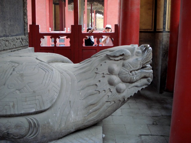 | Our guide is explainging to Karen that this poor mythical beast is carrying on its back the heaviest stone stele of the numerous stele on the temple grounds. On the next page you'll see his effort and what he thinks about his plight. |