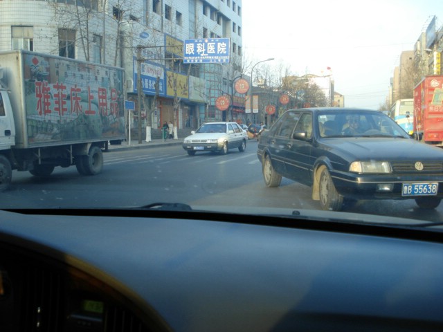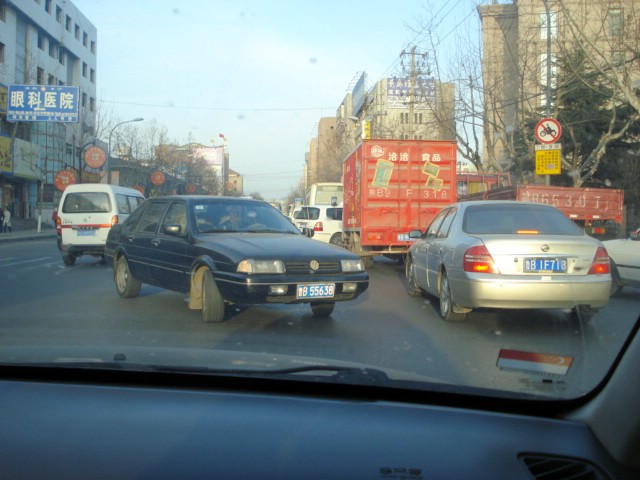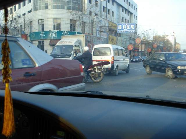 | I wish I could show you an OmniMax movie of rush-hour traffic because my pictures just don't do justice to the organized chaos on the roads around here. I snapped this sequence today. For what (little) it's worth, we had right-of-way at the time. |
