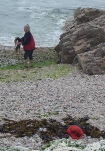 This lao ren is collecting edible seaweed. And, as for the seaweed that's invading Qingdao, I understand it's dried and turned into animal feed.