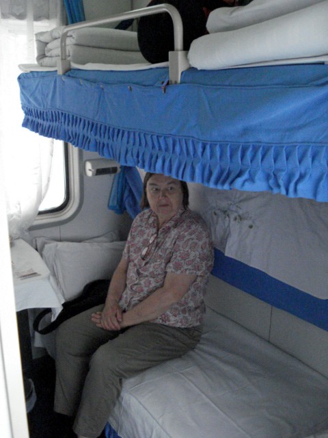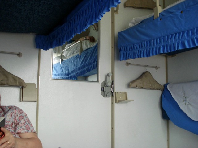 | Here's our 'soft' sleeper compartment. We shared the compartment with a middle-aged man and a young man. It was quiet when you shut the door. Karen quickly assumed the 'reading' position. | |||||||||||||||||