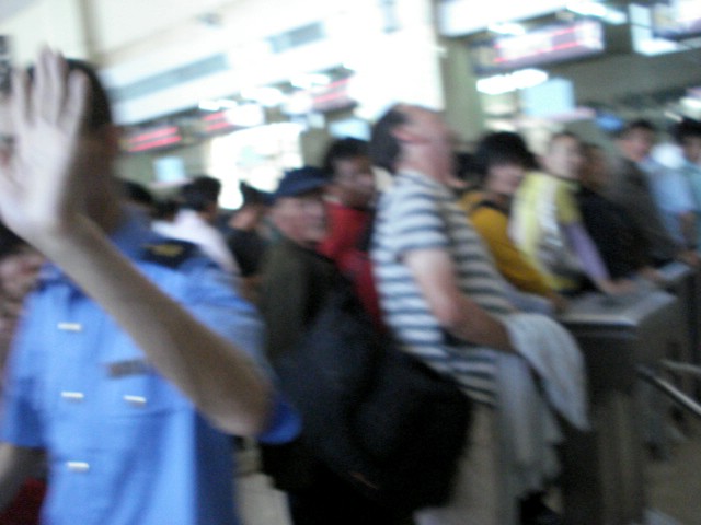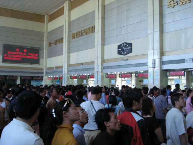 | But next morning was no less crowded and maybe even more so. If it weren't for the help from the train station employee on the right who didn't want to be photographed, we might still be standing in line. As it was, the only sleeper tickets remaining for Xi'an were of the 'hard' sleeper variety. I was just glad not to have to sit in a seat for the whole trip, so we grabbed them. | ![]() |