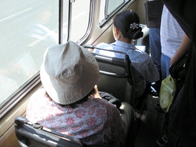 | I'm skipping over our day in Tai Yuan, which included a visit to a museum that was just as interesting to find as it was to visit. But I don' want to skip over Karen's first 'lao ren' experience. A young person actually got up on the city bus so Karen could sit down. |
