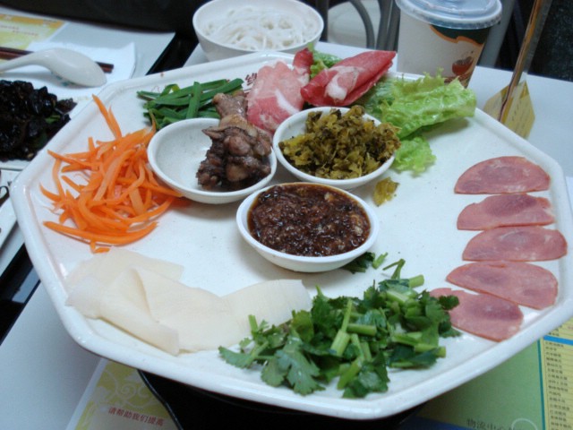| These are the raw ingredients of a special noodle that I had for lunch one day while we were visiting a factory. My co-worker selected these ingredients for me. I think you'll recognize the vegetables. That's thinly-sliced beef at |