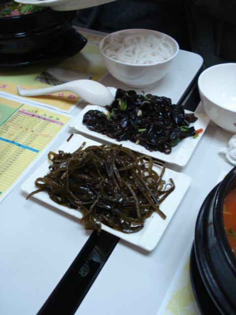 | 12 o'clock and pork at 3 o'clock. I can't remember what that is at 7 o'clock, but I think it was a vegetable and not tofu. That's a chicken drumstick to the right of the carrots, and some strong concoctions in the other two bowls. And here's two different types of seaweed. The waiter cracked a small bird's egg into the piping hot bowl of bouillon when he served it. That's my bowl barely visible over on the left. Then you add all the other |