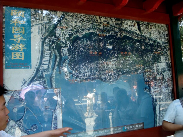 | Kunming Lake occupies three-quarters of the park and you can see only half of its expanse on this map. Using the map for reference, we entered the park from the far right center and walked from right to left along the shore. And then we took a boat ride. | ||||||||||||||||