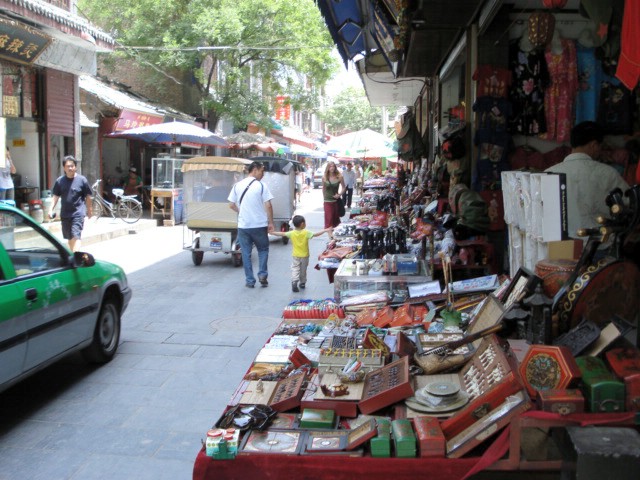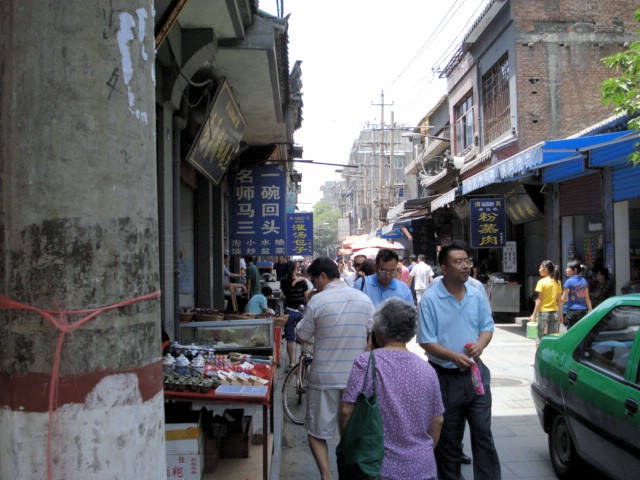 | The backstreets leading north from the Drum Tower have been home to Xi'an's Muslims since at least the 7th century. Karen and I were looking for the Great Mosque, but it was hidden down narrow lanes full of butcher shops, sesame-oil factories, and stringy-bearded men wearing white skullcaps. And souvenir shops. |