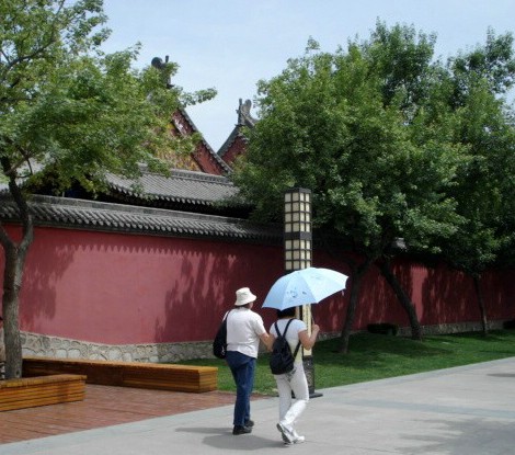 | After the end of the fountain show, here's Karen and our guide walking along the wall of the Da Ci'en Temple, which surrounds the pagoda. | ||||||||||||||