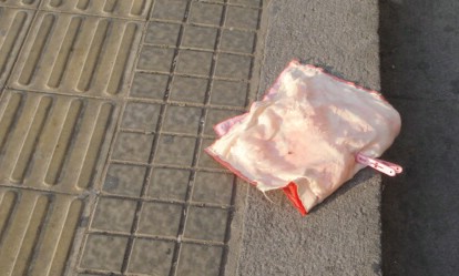 | Of course, there's a downside if it's too windy for the clothes pin to handle. One morning, I found this fallen item lying on the sidewalk between my bus stop and the office. | ||||||||||||||